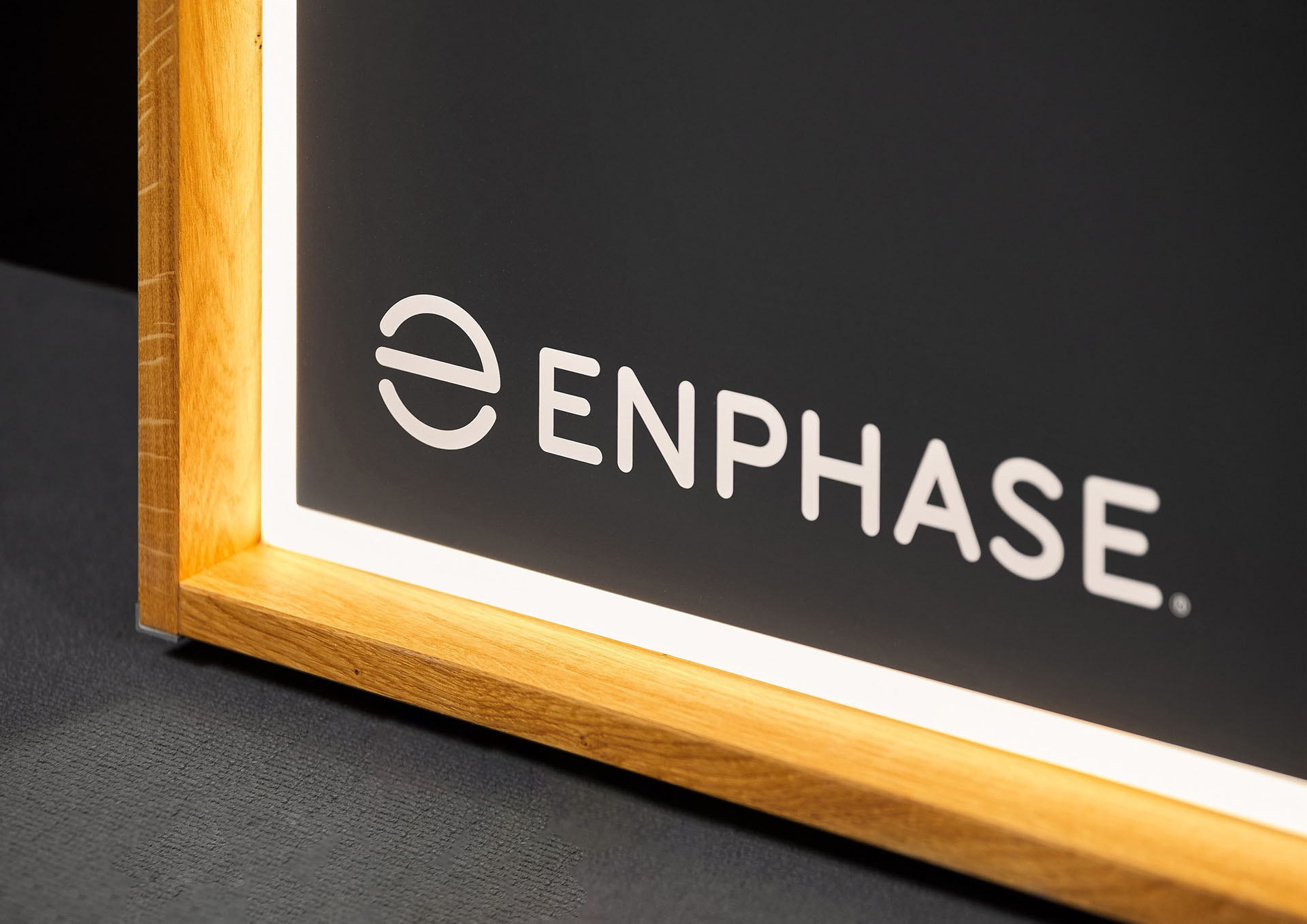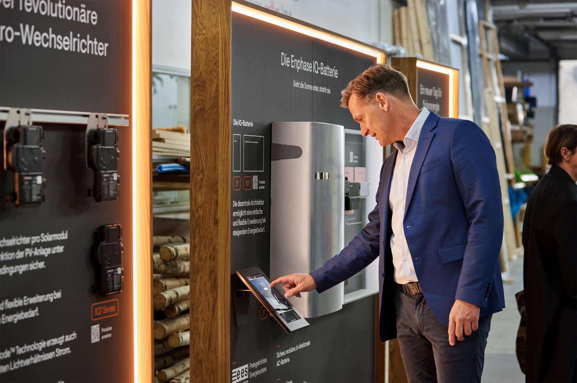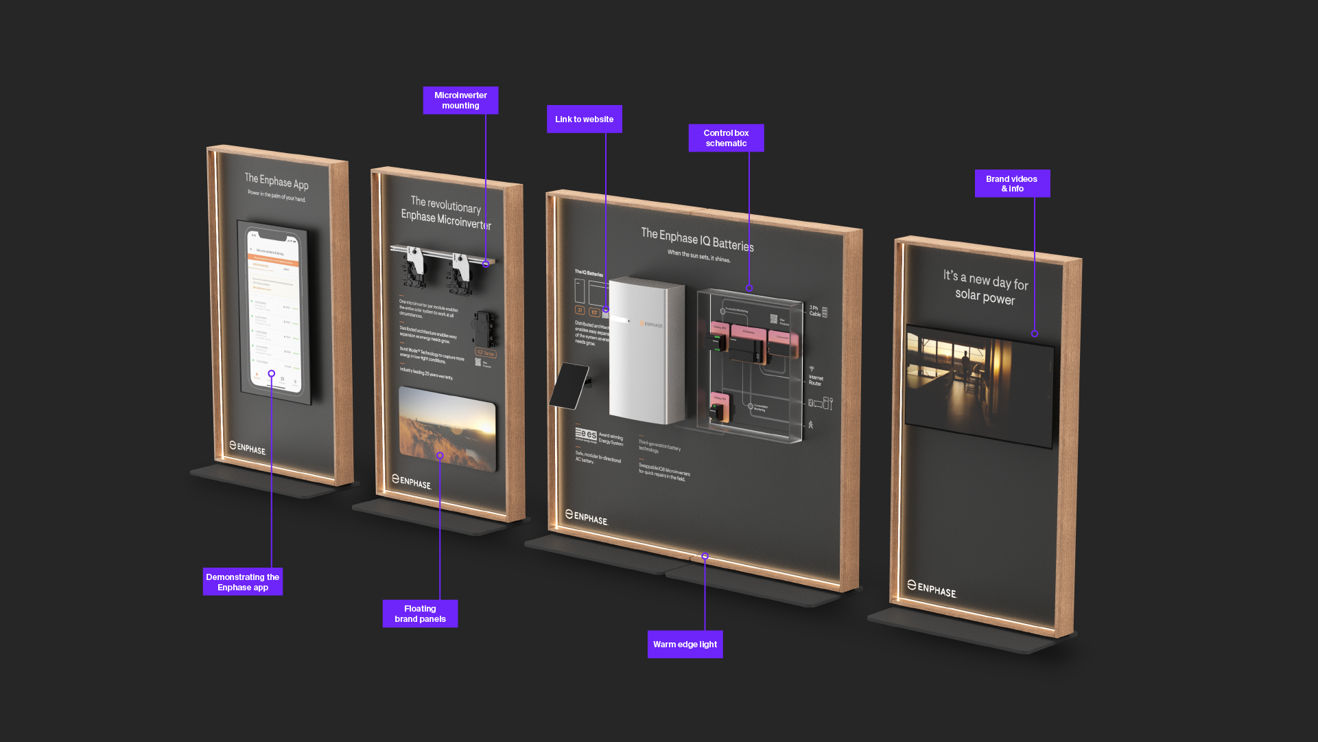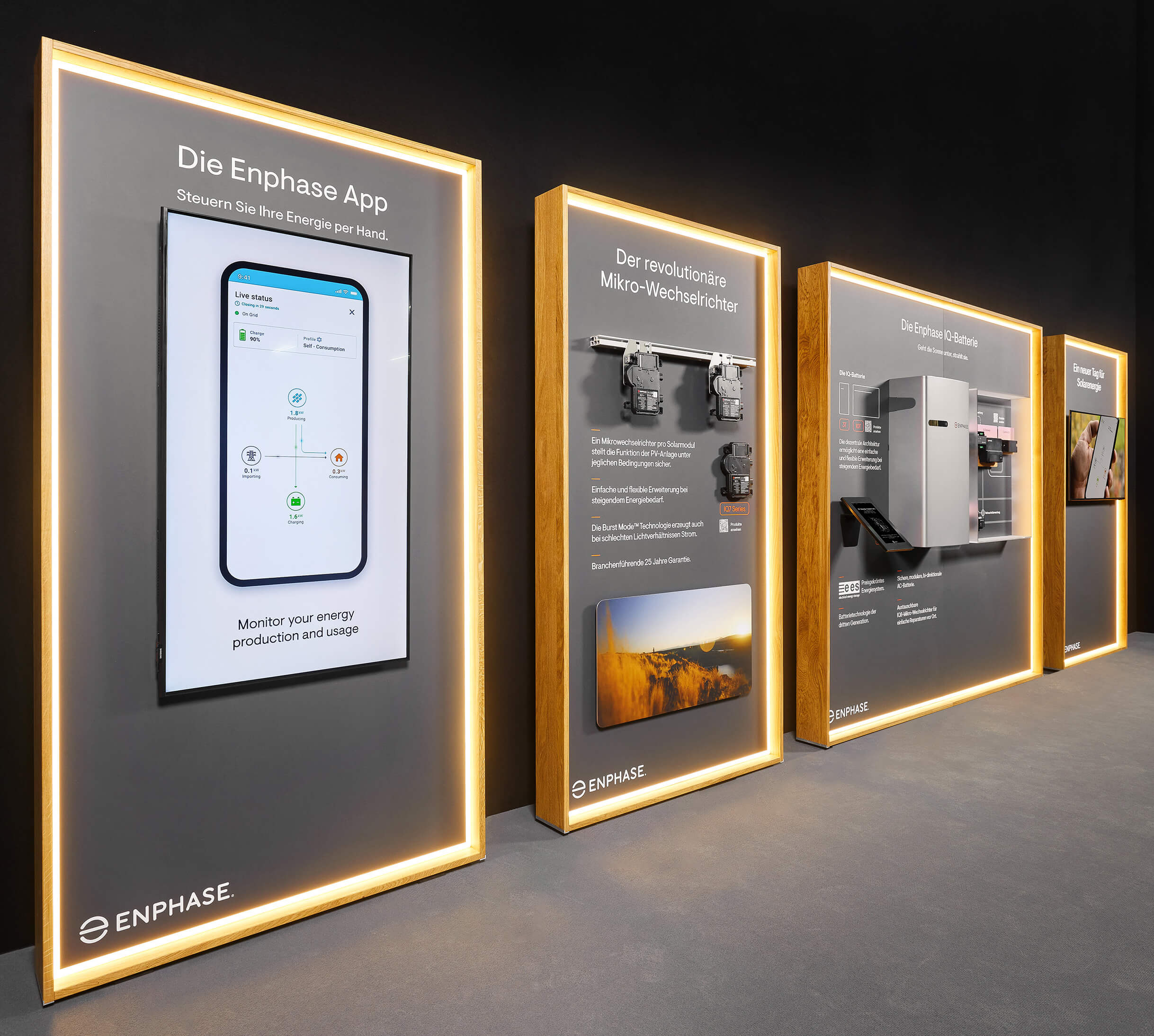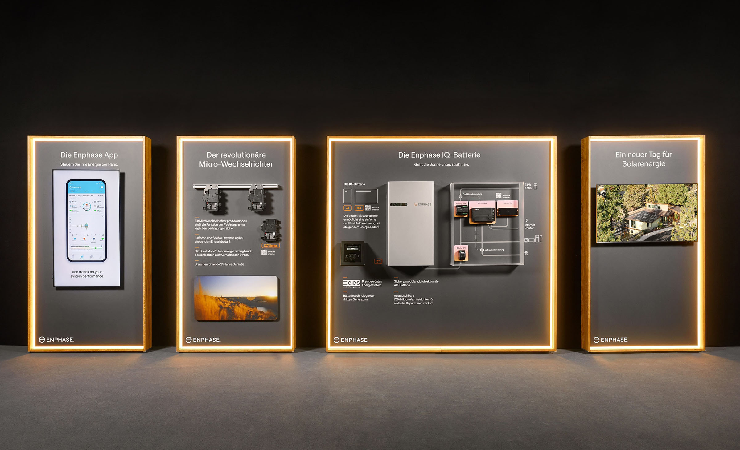 The core of the traveling exhibition consists of the Enphase frames. High-quality oak wood, accompanied by warm light strips, frames the descriptive product panels like paintings and thus lets the Enphase brand's claim to quality sustainability be heard.