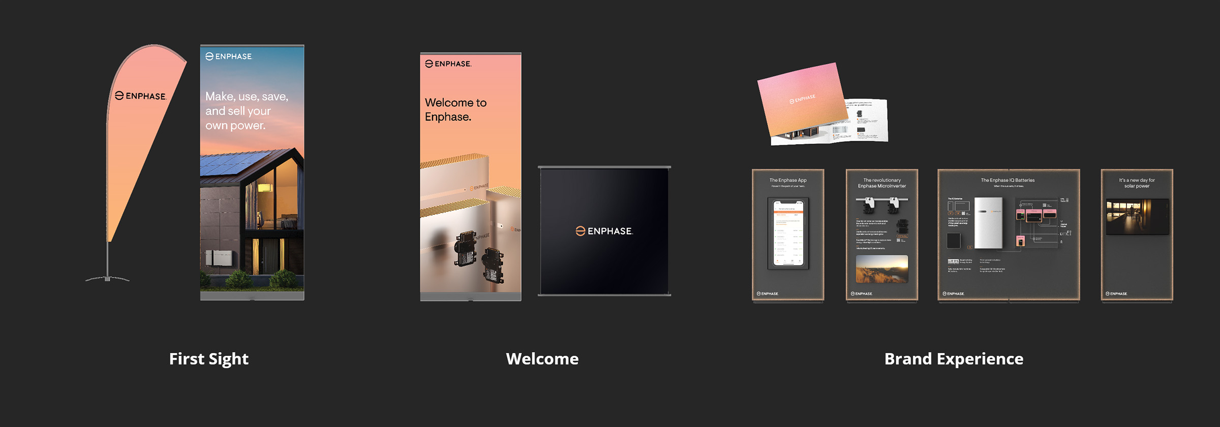 To make attending an Enphase event as enjoyable as possible, we have put together materials and brand touchpoints to guide and accompany the visitor throughout their stay: from the first look, to a warm welcome, to the full and immersive brand experience.