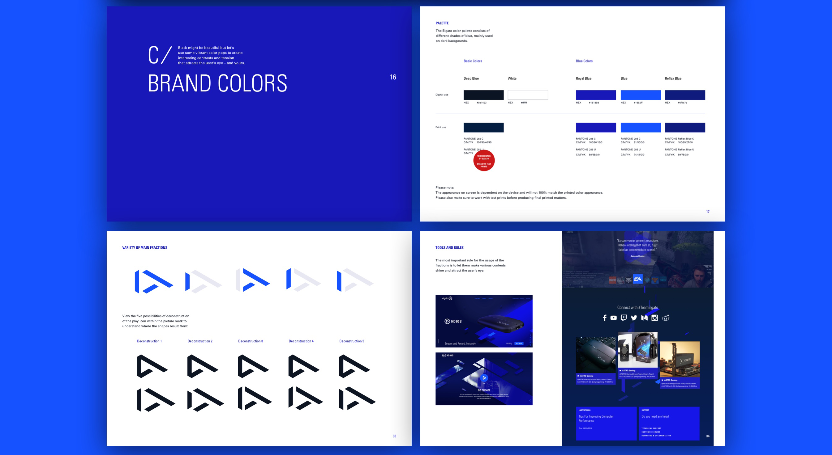 The color palette served another purpose: the blues were molded into fragments. These fragments are a deconstructed reference to the brand identity, and are sprinkled all throughout the website and other branded materials. The user is always skillfully reminded who they’re looking at. SMAL designed a grid for Elgato Gaming with characteristic icons. They put a twist on the icons by giving them a very specific angle, the angle being a part of the core design idea. Every icon is identifiable with the brand DNA.
