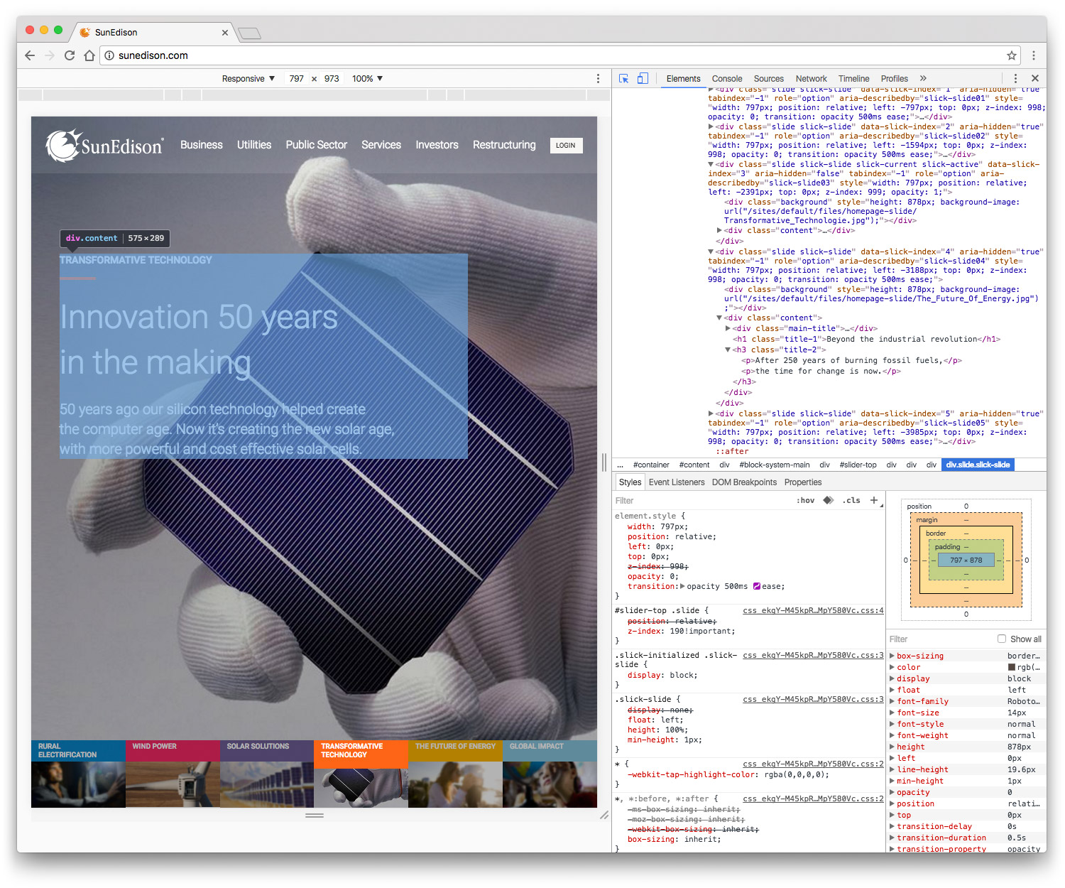 Optimizing the previously existing website design which was not mobile compatible, we first turned to the drawing boards: we wireframed, exported asset libraries and tested on every possible device to ensure final quality of this crucial touchpoint.The beauty of merging user interface design, communication design, development (front & backend), HTML5 and Drupal has blossomed into a brilliant touchpoint for SunEdison.